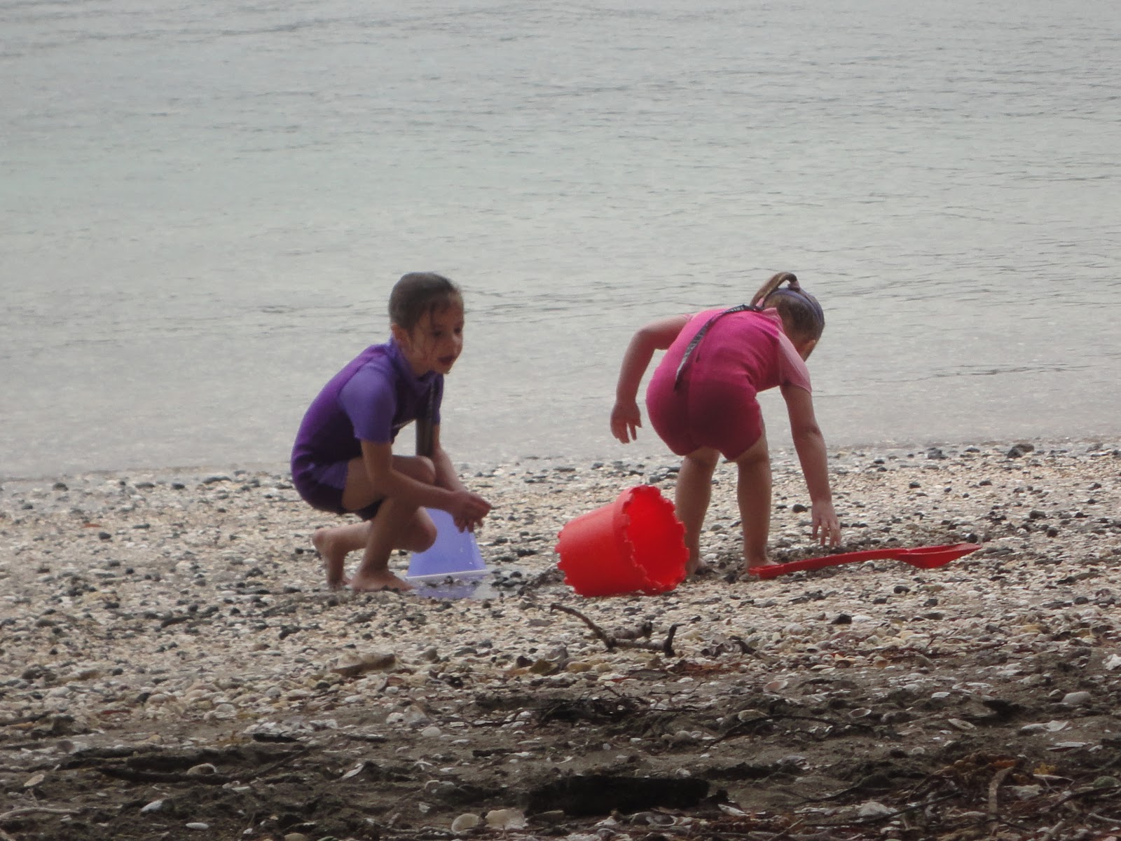We couldn’t believe how God turned on the weather for us…we had driven out of Auckland in the same pouring rain that had covered all of New Zealand for the last few days….and when we got here, we had sunshine. We quickly chucked on togs. Grabbed towels and made for the beach while we could. Scotts Landing was first up this trip… a very shelly beach popular for fishing boats. The kids had a blast. They were both straight into the water with their buckets, finding shells and stones that were ‘treasures’ and cleaning them in the water so that they sparkled. Jaimee begged me to let her take some home “so she can remember”. Awww…how can I say no to that?! I taught the girls how to pop the seaweed pods so they squirted water, much to their delight. Luke was not so impressed with his first visit to the beach, my quiet and placid boy promptly burst into tears when we dipped his wee toes into the cool water! He tried eating sand, didn’t like that much either. I felt very content with life sitting on towels in the sunshine with Marty and Luke watching the girls lie in the shallow water and pretend they were swimming ( their tummy’s were on the ground – that doesn’t count girls, but good trying)!